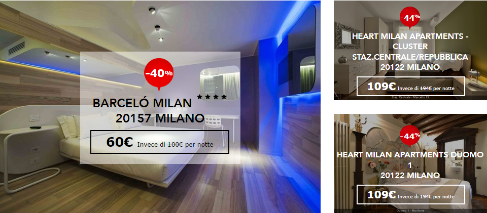 Come ho detto in precedenza, non mancano interessanti offerte in ogni parte d’Italia, basta solo inserire la città, la data e l’ora di arrivo per trovare la camera adatta alle tue necessità. Oggi analizzerò alcune occasioni nelle città italiane più grandi partendo da Milano dove al momento alcune soluzioni interessanti sono l’Hotel Barcelò Milan a quattro stelle caratterizzato da un lusso moderno e incredibilmente originale a soli 60 € per notte, spa inclusa.
